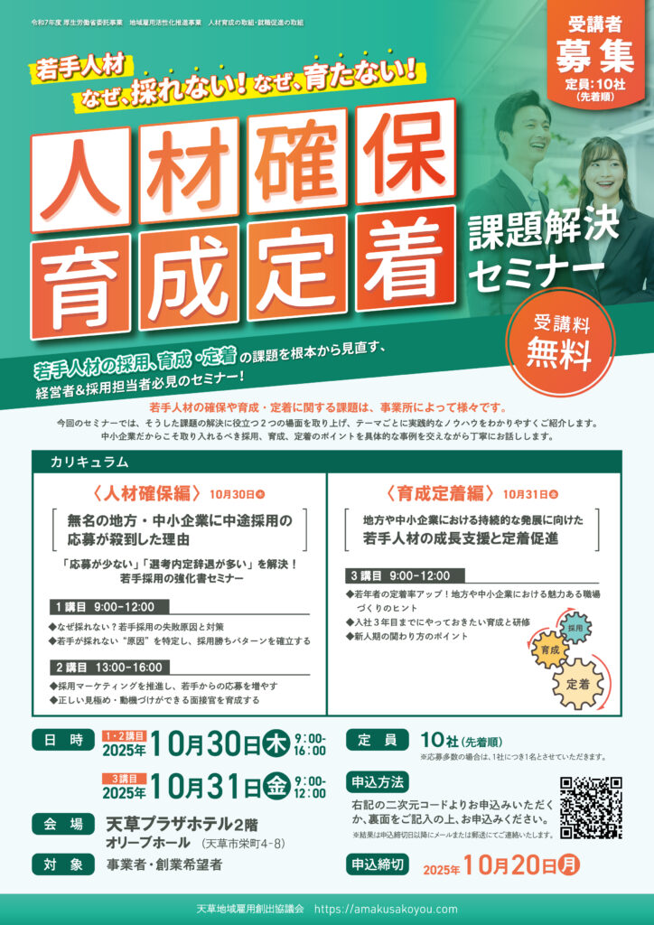 若手人材、なぜ、採れない!なぜ、育たない!若手人材の採用、育成・定着の課題を根本から見直す、経営者&採用担当者必見のセミナー! 「人材確保・育成定着 課題解決セミナー」